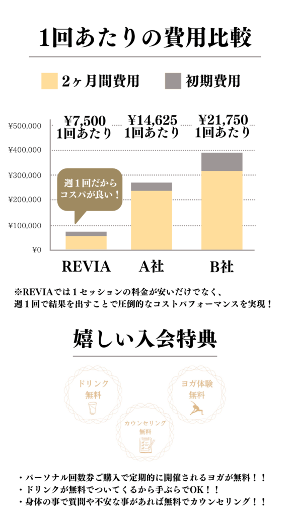 REVIAではパーソナルトレーニング回数券をご購入の方に無料でセミパーソナルヨガをご提供させて頂いております。