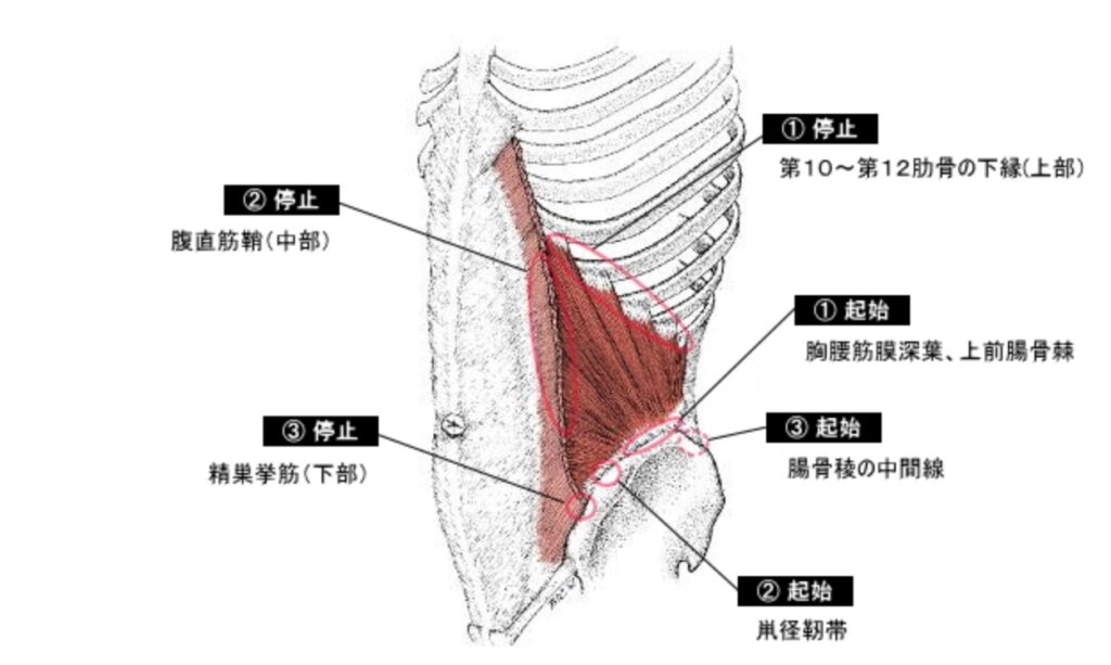 内腹斜筋:骨盤側の腸骨稜や胸腰筋膜から起始し、第10~12肋骨および腹直筋鞘・白線に停止する