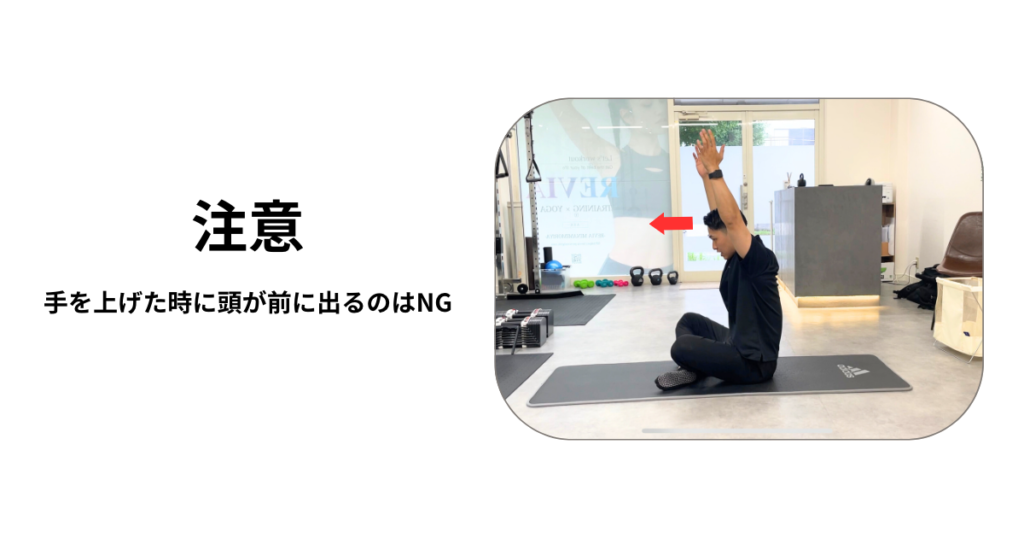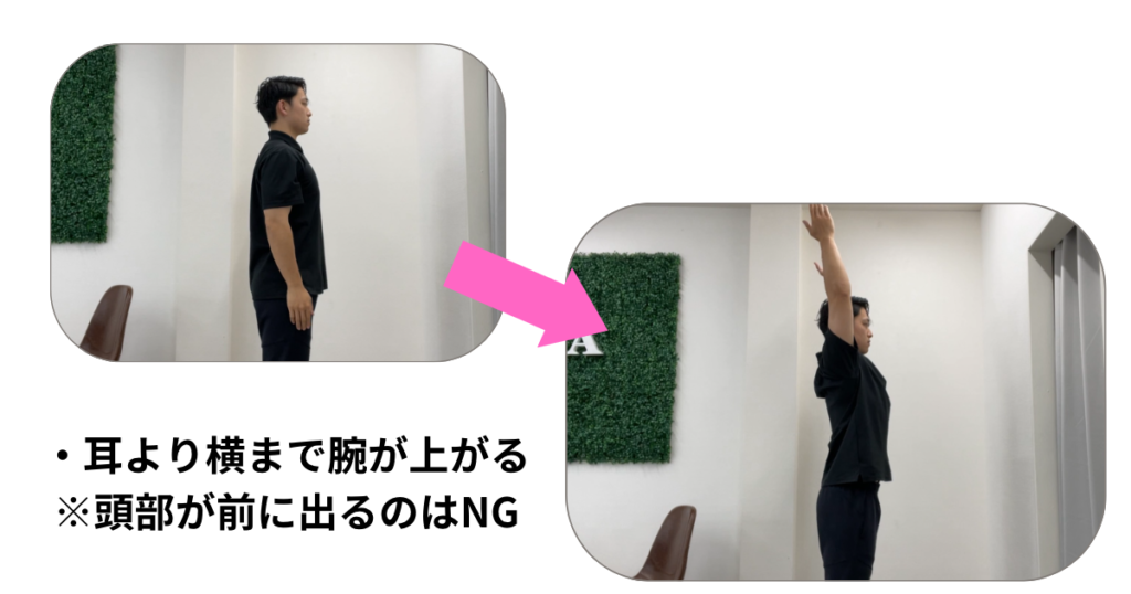 2.肘をなるべく伸ばしたまま、耳のラインまで手をあげる