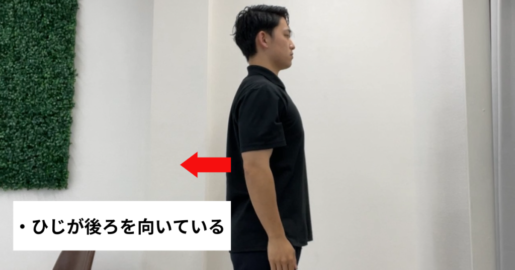 2.まっすぐ立った状態で身体の横に腕をたらした状態で肘の位置が後方に向くのが正常ですが外方向に肘が向いていれば巻き肩です。もしくは正面から見て手の甲が相手に見えてしまう。
