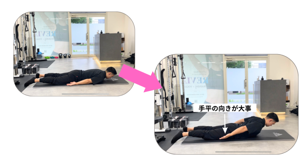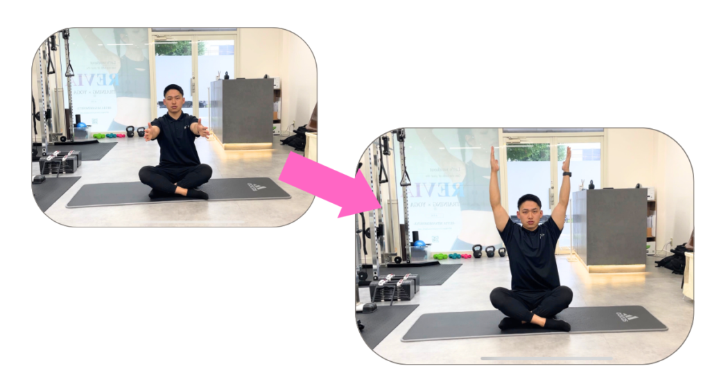 2.掌を上にしたまま、胸をはり肩甲骨を寄せていく